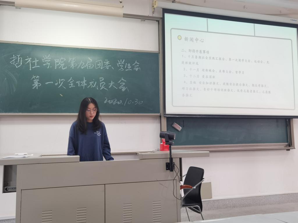 大会在全体成员奏唱的校歌声中拉开帷幕。团委副书记蒋钦政、刘泽一、刘津以及学生会副主席侯雨潼,分别上台汇报各部门工作。各位发言人从部门常规工作的角度介绍了各部门的职能与工作流程,总结了九月、十月已完成的工作项目并给出十一月、十二月的工作计划。多方面、全方位地展示了工作情况。
