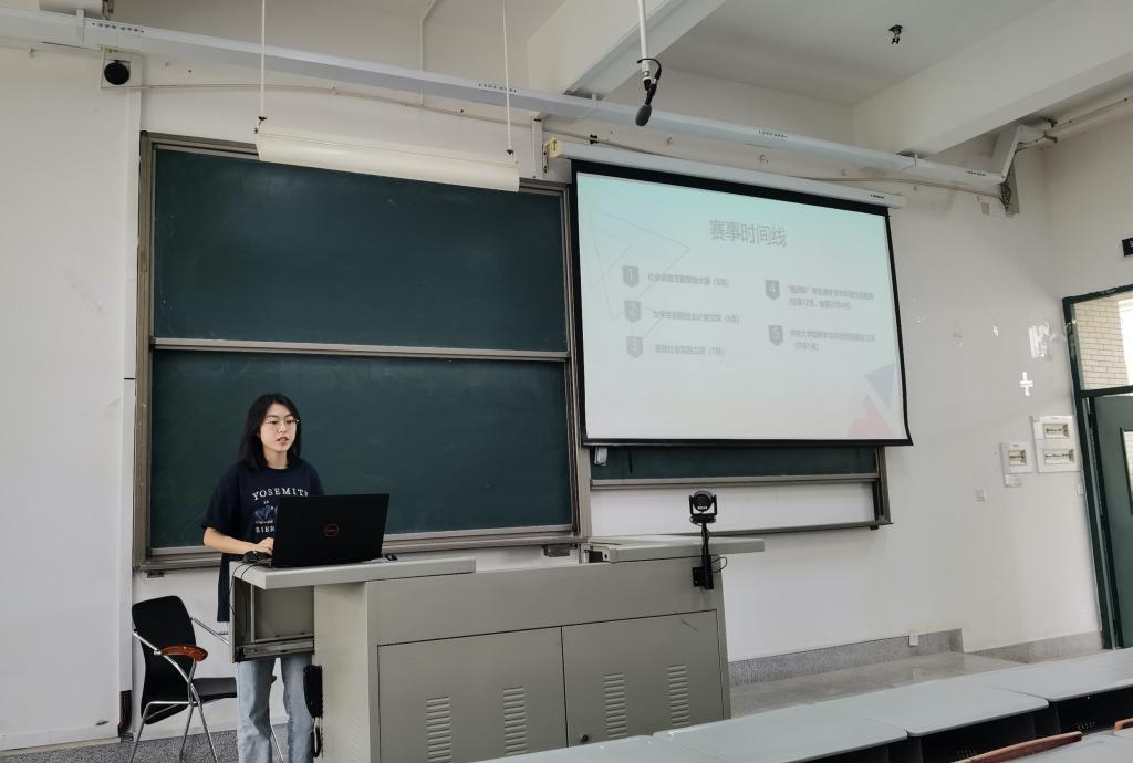 19级社会学1班何家欢,重点为大家介绍了赛程经过,学生能从对挑战杯大赛的准备工作中,获得个人能力的提升。将最初的选题大纲一步一步完善,能看到整体团队的成熟和个人成长,借此引导大家要认真对待每一次科创比赛,抓住机会,并强调说明了团队合作的重要性。