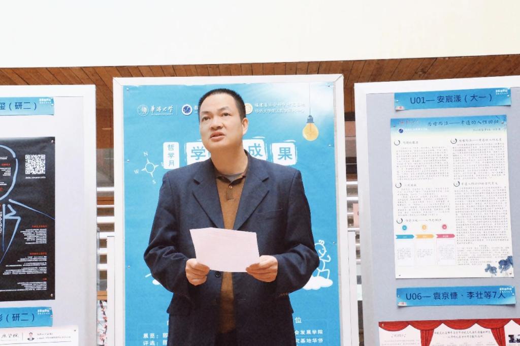 三楼,共同参与了闭幕式暨颁奖仪式。闭幕式由李永松书记致开场词。李书记先向大赛的成功举办致以热烈祝贺,并感谢所有协助大赛成功举办的老师与同学,李书记指出:“本次大赛围绕‘哲学学术成果’展开,主题鲜明,这种‘以海报表达思想’,将哲理转化为图形,将比赛与专业相结合,从自己的研究兴趣出发,不断收集、探究、融合,传达出非同凡响的哲理,引发大众的触动与共鸣,推动我们哲社学子追寻求真、求实的理性精神,提升学术素养,推进学术研究具有意义重大。”李书记鼓励各位同学能继续保持学术研究的热情和兴趣,树立良好的学术风尚,继续走进哲学、亲近哲学、感受哲学的魅力,在不断阅读、聆听和思考中学有所成、思有所悟。